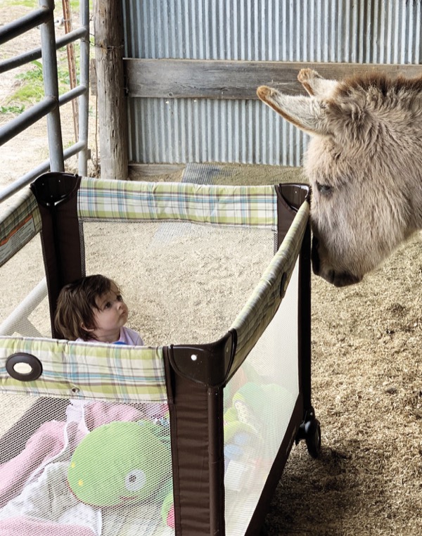 Gadgets: We purchased a long-range video baby monitor that allowed me to be in the barn while Harley was sleeping in the house, which was great when the weather was too hot or cold. We purchased a collapsible soft-sided garden cart, which was a great wagon and, when he was small, it contained him or gave him a place to sleep.