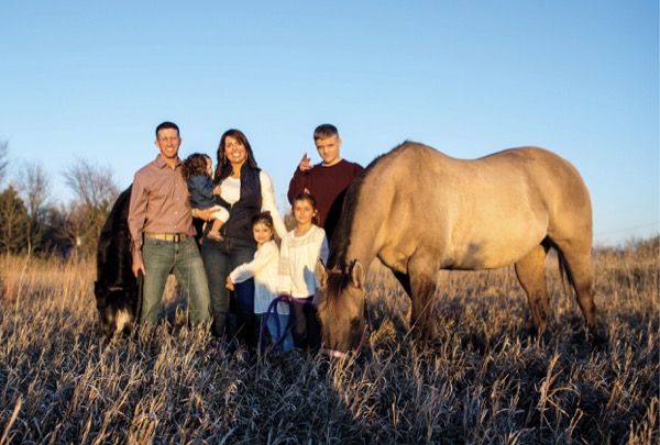 Although her reining horse lives at her trainer’s, Jodi Oleen says that keeping a couple of horses at her house helps her stay grounded. She is pictured with her family: Husband Josh; daughter Ava; daughter Ainsley; stepdaughter Abby; stepson Liam; and their two at-home horses, Kid and Blue Chips Valena.