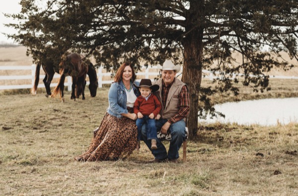 Iowa mom and team roper Melanie Rice says preparation is key to being able to balance a toddler at a team roping. She is pictured here with her husband, Jake, and son, Harley.